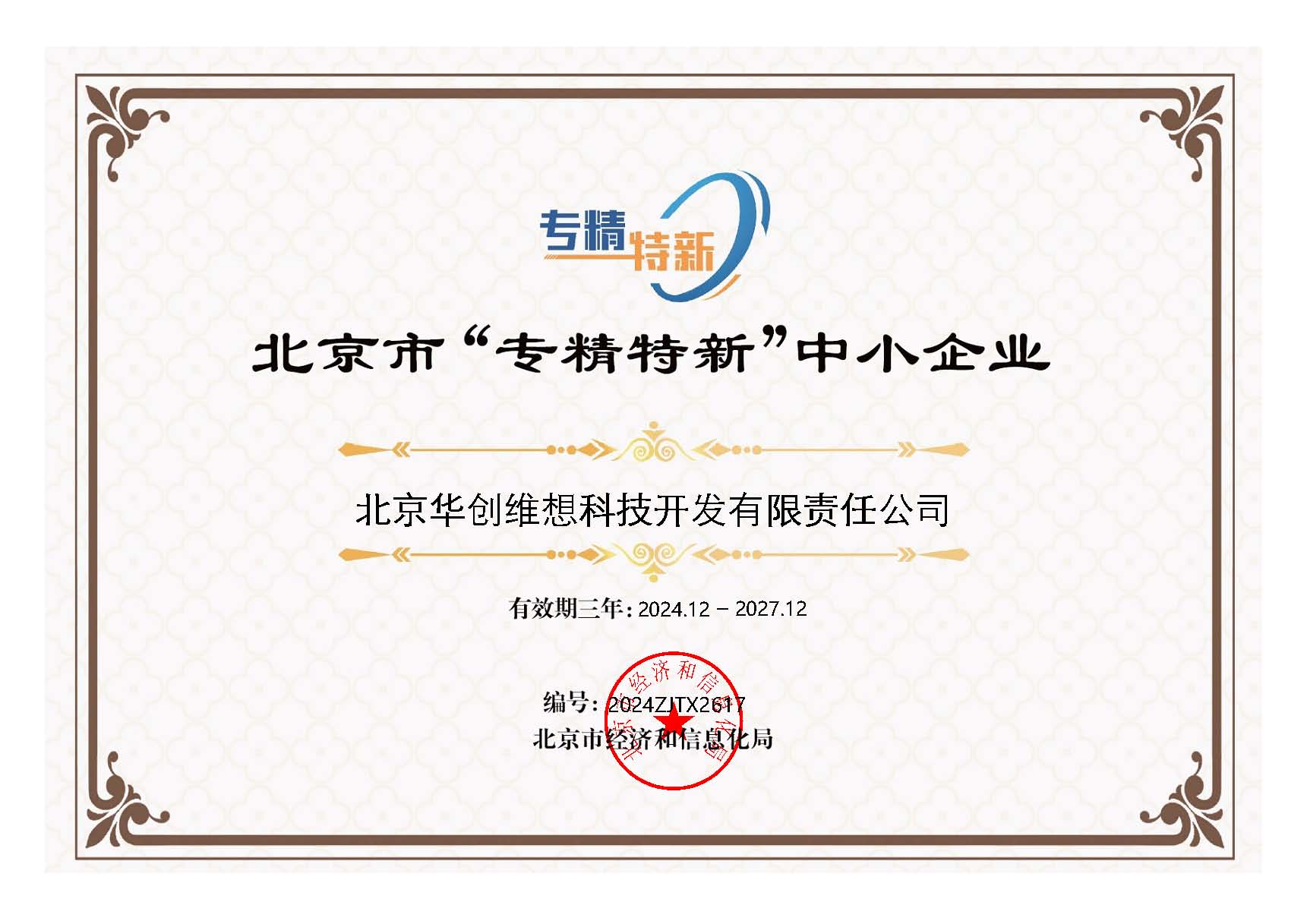 喜報(bào)—華創(chuàng)維想獲得北京市“專精特新”中小企業(yè)證書(shū)